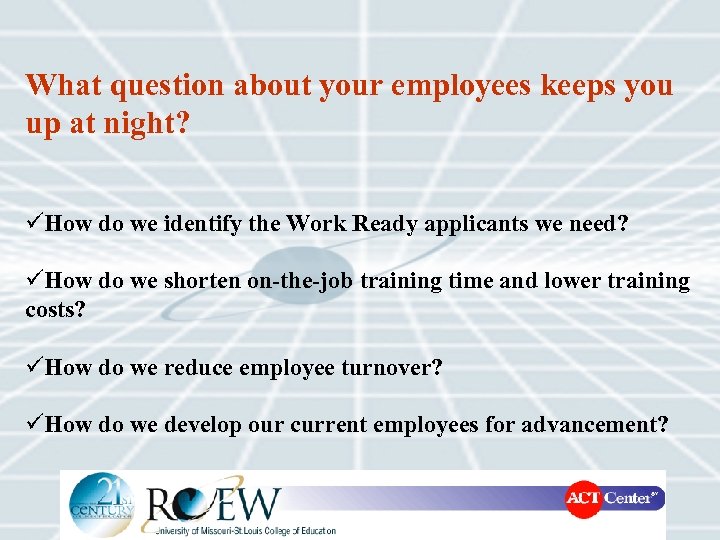 What question about your employees keeps you up at night? üHow do we identify the Work Ready applicants we need? üHow do we shorten on-the-job training time and lower training costs? üHow do we reduce employee turnover? üHow do we develop our current employees for advancement?