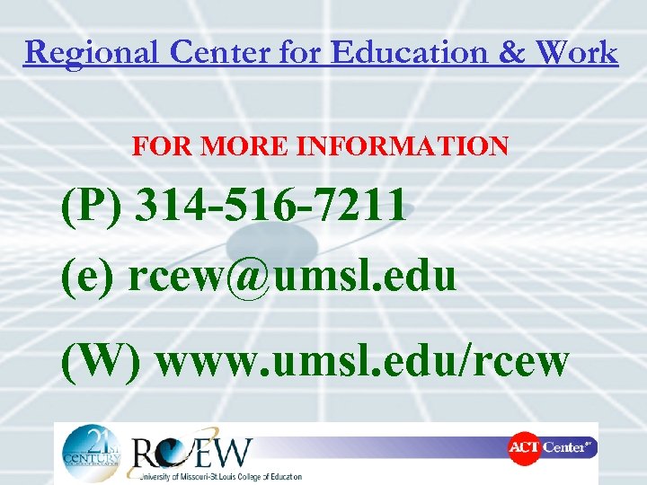 Regional Center for Education & Work FOR MORE INFORMATION (P) 314 -516 -7211 (e) rcew@umsl. edu (W) www. umsl. edu/rcew
