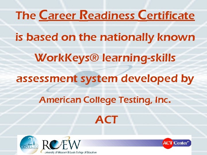 The Career Readiness Certificate is based on the nationally known Work. Keys® learning-skills assessment system developed by American College Testing, Inc. ACT