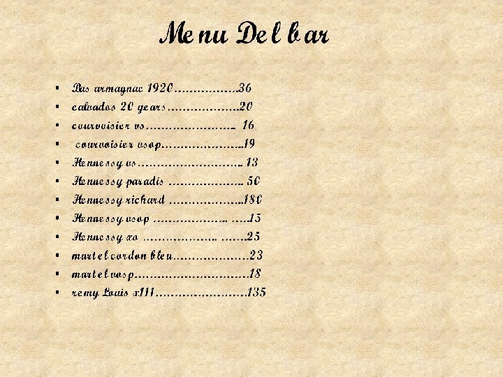 Bar cont. . Remy martin vsop……………… 15 Remy martin xo………………. . 25 vino de amor………………… 125 white wines Spanish, Italian………… 130 red wines Spanish, Italian………… 130 house specials martini de la familia delay candy apple and grape martini made with absolute fruit pucker, midori, liquour, roses and lime grenadine……… 15 mas a venir.