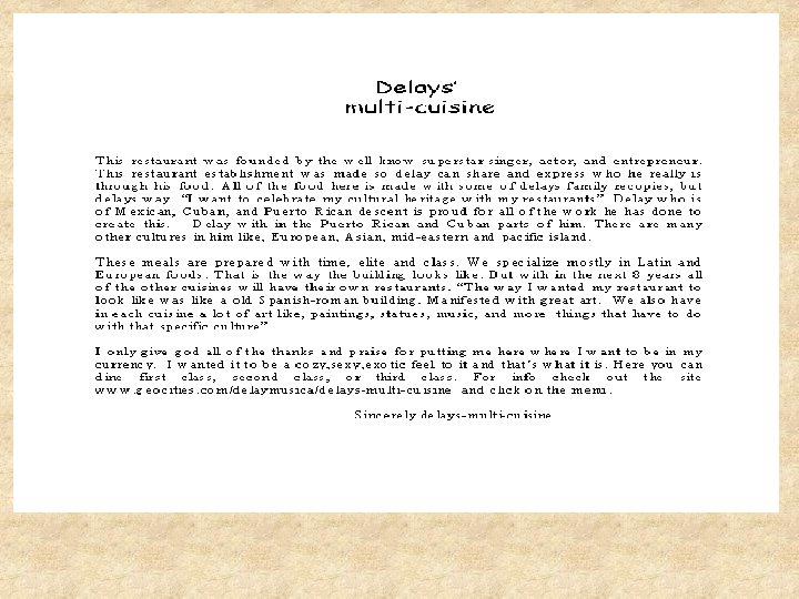 A letter from the founder Welcome to Delays’ Multi-Cuisine of the finest restaurants in the whole Los Angeles area. Delays’ Multi-cuisine is a restaurant founded by the well known singer and actor Devion Lavel (Delay) young. This is a restaurant with many different cuisine’s. just like delay is many different cultures but he’s Mexican, Cuban, and puertorican but in those cultures there are lots more like, native American, European, mid-eastern, Polynesian, and Asian. we are an upper class five star restaurant. Here at delays’ multi-cuisine we require formal to semi-formal dress. (not just any way/casual. ) and if you come not in a formal to semi-formal attire you will be asked politely to leave and you will be escorted out. When you dine at delays multi-cuisine you have many options available to you at any time. You could go and get relaxed at our coed spa, While you are waiting for your table to be available. The spa only adds 2 dollars to your bill.