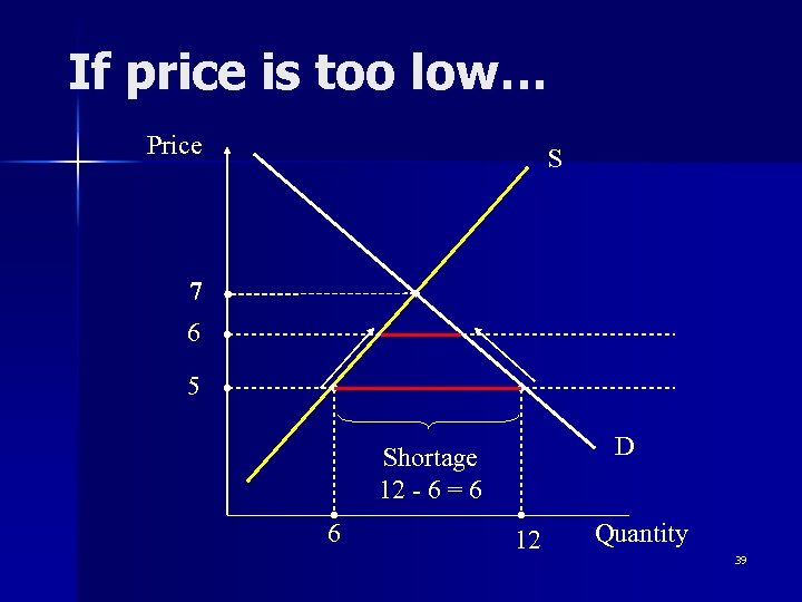 If price is too low… Price S 7 6 5 D Shortage 12 - 6 = 6 6 12 Quantity 39
