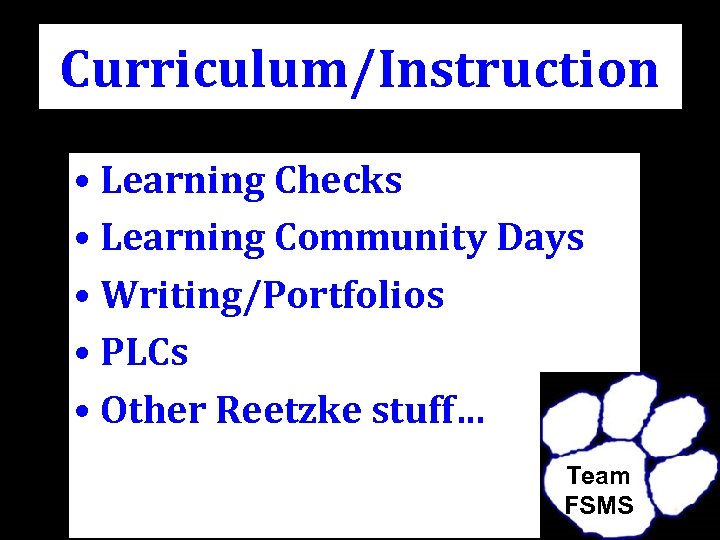 Curriculum/Instruction • Learning Checks • Learning Community Days • Writing/Portfolios • PLCs • Other Reetzke stuff… Team FSMS