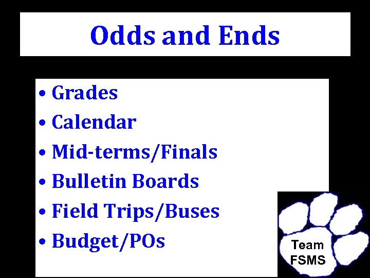 Odds and Ends • Grades • Calendar • Mid-terms/Finals • Bulletin Boards • Field Trips/Buses • Budget/POs Team FSMS