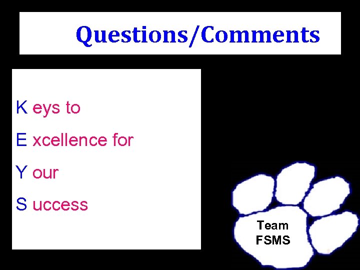 Questions/Comments K eys to E xcellence for Y our S uccess Team FSMS