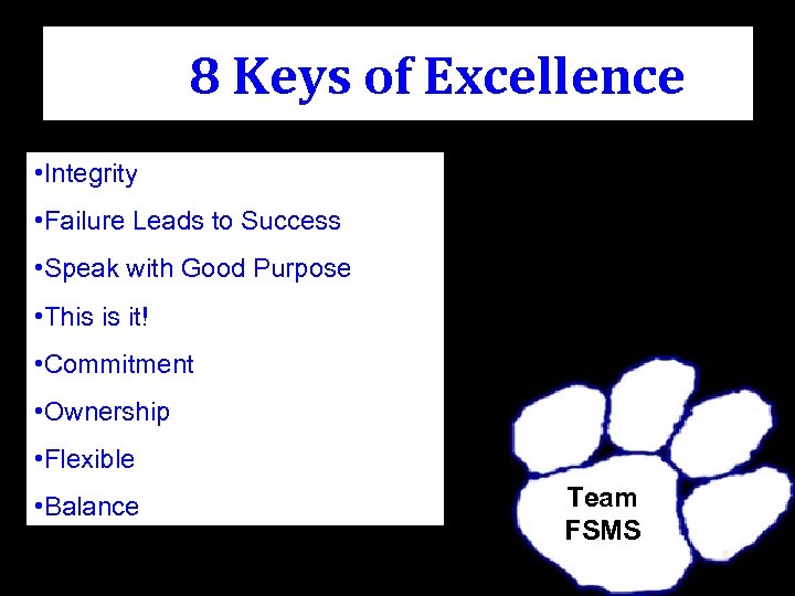 8 Keys of Excellence • Integrity • Failure Leads to Success • Speak with Good Purpose • This is it! • Commitment • Ownership • Flexible • Balance Team FSMS