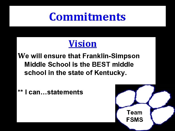 Commitments Vision We will ensure that Franklin-Simpson Middle School is the BEST middle school in the state of Kentucky. ** I can…statements Team FSMS