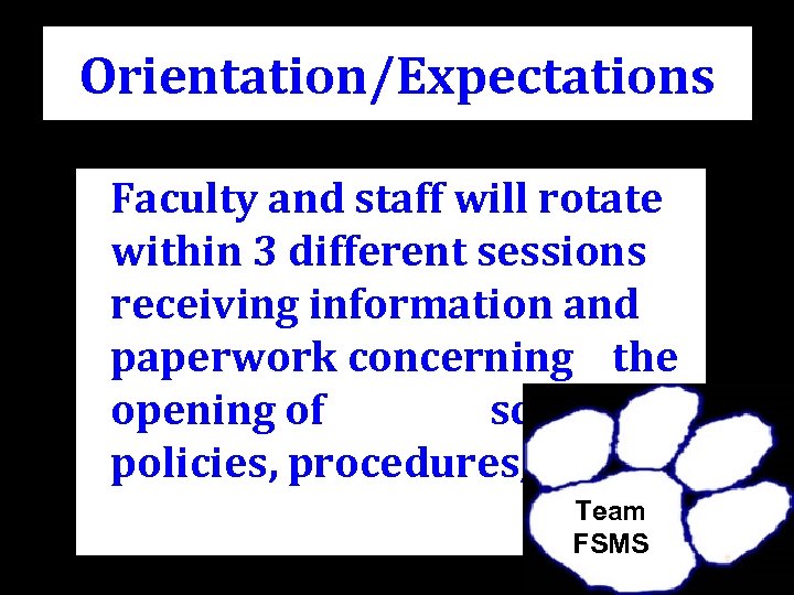 Orientation/Expectations Faculty and staff will rotate within 3 different sessions receiving information and paperwork concerning the opening of school, policies, procedures, etc. Team FSMS