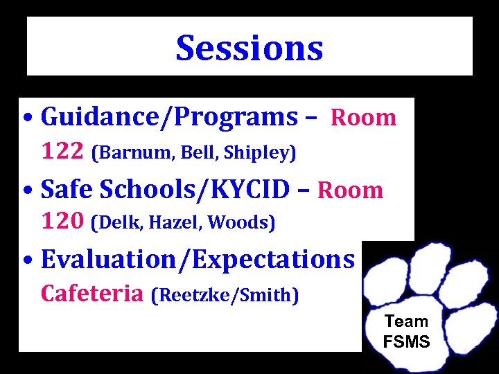 Sessions • Guidance/Programs – Room 122 (Barnum, Bell, Shipley) • Safe Schools/KYCID – Room 120 (Delk, Hazel, Woods) • Evaluation/Expectations – Cafeteria (Reetzke/Smith) Team FSMS
