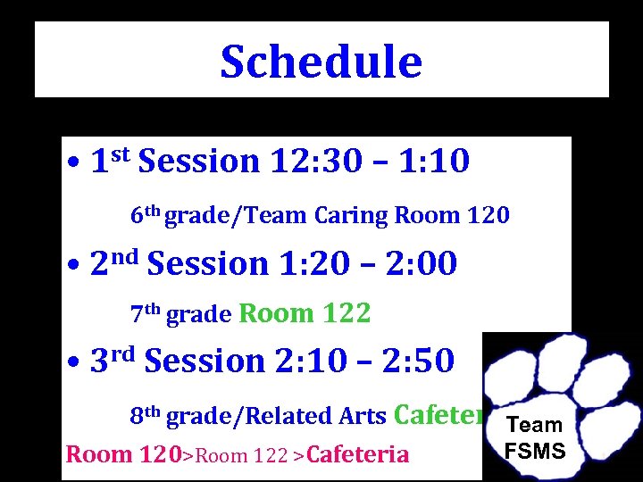 Schedule • 1 st Session 12: 30 – 1: 10 6 th grade/Team Caring Room 120 • 2 nd Session 1: 20 – 2: 00 7 th grade Room 122 • 3 rd Session 2: 10 – 2: 50 8 th grade/Related Arts Cafeteria Team Room 120>Room 122 >Cafeteria FSMS