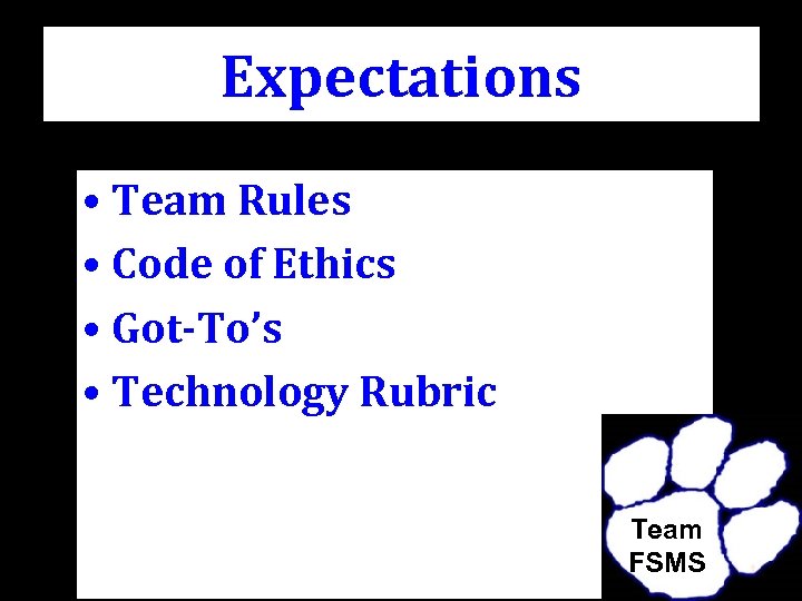 Expectations • Team Rules • Code of Ethics • Got-To’s • Technology Rubric Team FSMS