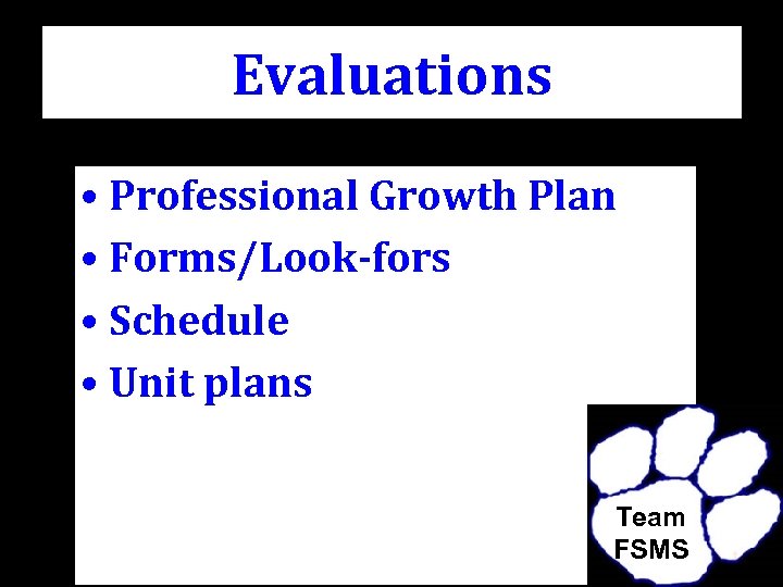 Evaluations • Professional Growth Plan • Forms/Look-fors • Schedule • Unit plans Team FSMS
