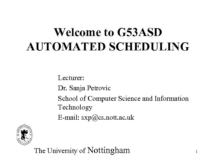 Welcome to G 53 ASD AUTOMATED SCHEDULING Lecturer: Dr. Sanja Petrovic School of Computer Science and Information Technology E-mail: sxp@cs. nott. ac. uk The University of Nottingham 1