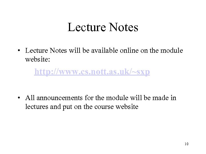 Lecture Notes • Lecture Notes will be available online on the module website: http: //www. cs. nott. as. uk/~sxp • All announcements for the module will be made in lectures and put on the course website 10