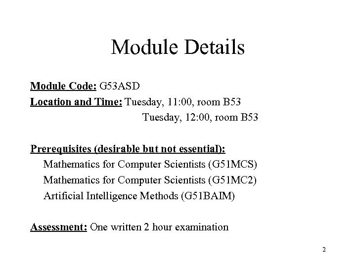 Module Details Module Code: G 53 ASD Location and Time: Tuesday, 11: 00, room B 53 Tuesday, 12: 00, room B 53 Prerequisites (desirable but not essential): Mathematics for Computer Scientists (G 51 MCS) Mathematics for Computer Scientists (G 51 MC 2) Artificial Intelligence Methods (G 51 BAIM) Assessment: One written 2 hour examination 2
