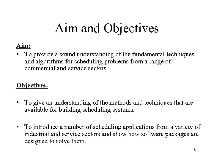 Aim and Objectives Aim: • To provide a sound understanding of the fundamental techniques and algorithms for scheduling problems from a range of commercial and service sectors. Objectives: • To give an understanding of the methods and techniques that are available for building scheduling systems. • To introduce a number of scheduling applications from a variety of industrial and service sectors and show software packages are designed to solve them. 3