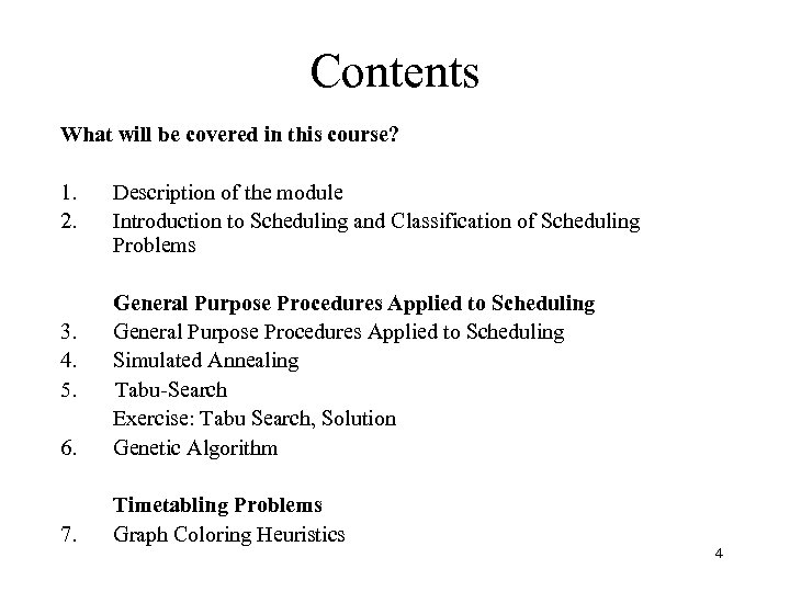 Contents What will be covered in this course? 1. 2. Description of the module Introduction to Scheduling and Classification of Scheduling Problems 6. General Purpose Procedures Applied to Scheduling Simulated Annealing Tabu-Search Exercise: Tabu Search, Solution Genetic Algorithm 7. Timetabling Problems Graph Coloring Heuristics 3. 4. 5. 4