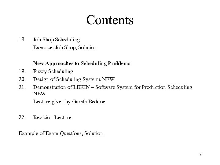 Contents 18. 19. 20. 21. 22. Job Shop Scheduling Exercise: Job Shop, Solution New Approaches to Scheduling Problems Fuzzy Scheduling Design of Scheduling Systems NEW Demonstration of LEKIN – Software System for Production Scheduling NEW Lecture given by Gareth Beddoe Revision Lecture Example of Exam Questions, Solution 7