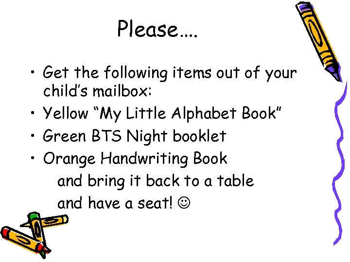 Please…. • Get the following items out of your child’s mailbox: • Yellow “My Little Alphabet Book” • Green BTS Night booklet • Orange Handwriting Book and bring it back to a table and have a seat!