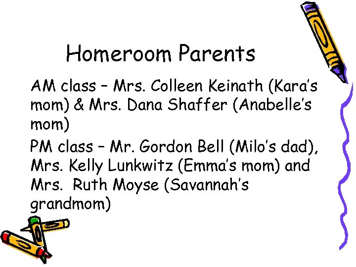Homeroom Parents AM class – Mrs. Colleen Keinath (Kara’s mom) & Mrs. Dana Shaffer (Anabelle’s mom) PM class – Mr. Gordon Bell (Milo’s dad), Mrs. Kelly Lunkwitz (Emma’s mom) and Mrs. Ruth Moyse (Savannah’s grandmom)