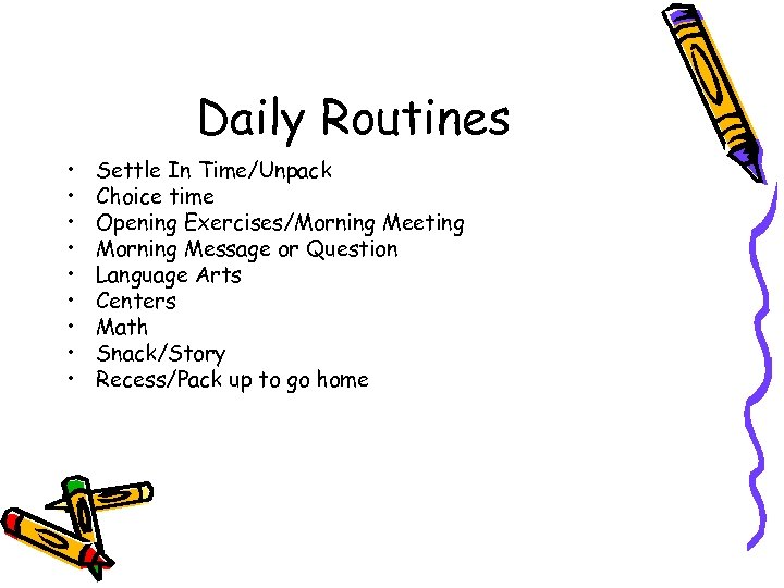 Daily Routines • • • Settle In Time/Unpack Choice time Opening Exercises/Morning Meeting Morning Message or Question Language Arts Centers Math Snack/Story Recess/Pack up to go home
