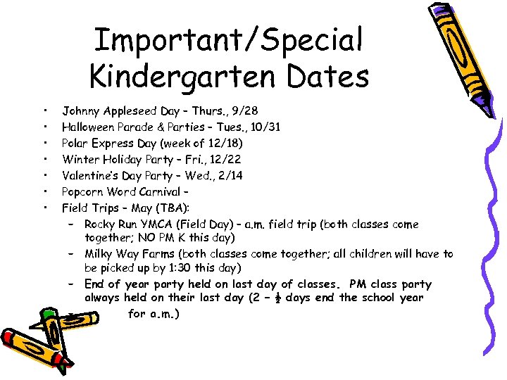 Important/Special Kindergarten Dates • • Johnny Appleseed Day – Thurs. , 9/28 Halloween Parade & Parties – Tues. , 10/31 Polar Express Day (week of 12/18) Winter Holiday Party – Fri. , 12/22 Valentine’s Day Party – Wed. , 2/14 Popcorn Word Carnival – Field Trips – May (TBA): – Rocky Run YMCA (Field Day) – a. m. field trip (both classes come together; NO PM K this day) – Milky Way Farms (both classes come together; all children will have to be picked up by 1: 30 this day) – End of year party held on last day of classes. PM class party always held on their last day (2 – ½ days end the school year – for a. m. )