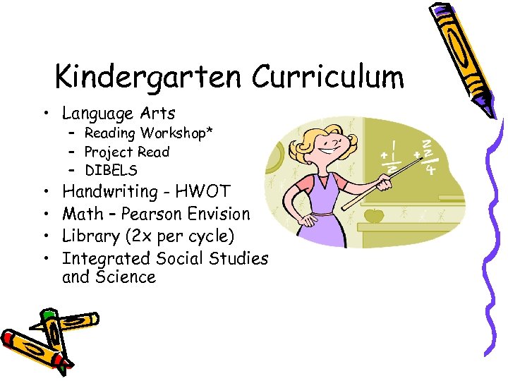 Kindergarten Curriculum • Language Arts • • – Reading Workshop* – Project Read – DIBELS Handwriting - HWOT Math – Pearson Envision Library (2 x per cycle) Integrated Social Studies and Science