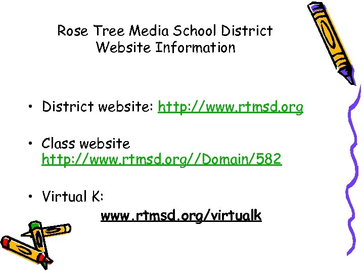 Rose Tree Media School District Website Information • District website: http: //www. rtmsd. org • Class website http: //www. rtmsd. org//Domain/582 • Virtual K: www. rtmsd. org/virtualk
