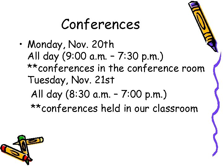 Conferences • Monday, Nov. 20 th All day (9: 00 a. m. – 7: 30 p. m. ) **conferences in the conference room Tuesday, Nov. 21 st All day (8: 30 a. m. – 7: 00 p. m. ) **conferences held in our classroom