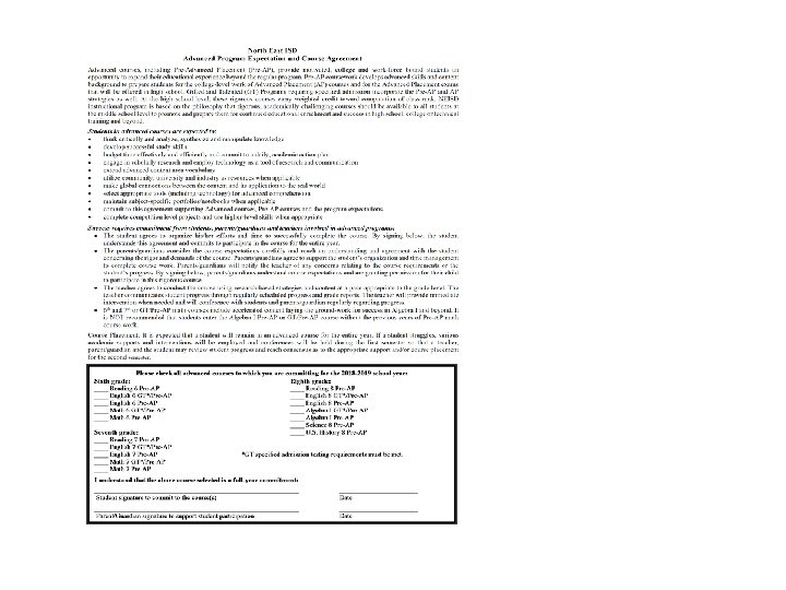 üStudent and Parent must sign the Advanced Program Expectation and Course Agreement Form on the back of the course selection card. If it is not signed, the student will not be placed in a Pre-AP class. üStudents must be in a Pre-AP Math in 6 th grade to be in Pre-Algebra in 7 th grade, and in 7 th grade Pre-Algebra to be in 8 th grade Algebra I. It is strongly recommended that you consult with your child’s Math teacher. üThe exit point for Pre-AP course is either at the end of the first three weeks or at the end of the nine-week grading period. If these exit points are missed, then the student will remain in the course for the remainder of the semester. üA teacher-parent conference is required and teacher must submit Add/Drop form to counselor for a schedule change to be placed in a regular class.