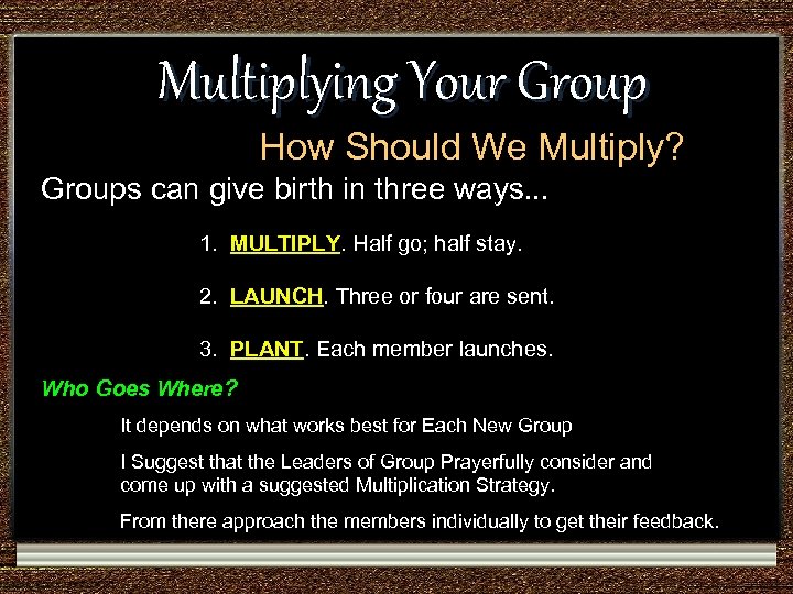 Multiplying Your Group How Should We Multiply? Groups can give birth in three ways. . . 1. MULTIPLY. Half go; half stay. 2. LAUNCH. Three or four are sent. 3. PLANT. Each member launches. Who Goes Where? It depends on what works best for Each New Group I Suggest that the Leaders of Group Prayerfully consider and come up with a suggested Multiplication Strategy. From there approach the members individually to get their feedback.