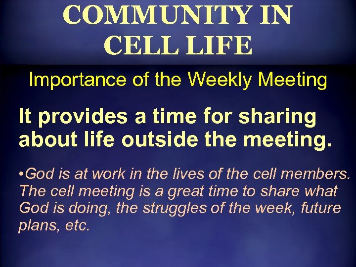 COMMUNITY IN CELL LIFE Importance of the Weekly Meeting It provides a time for sharing about life outside the meeting. • God is at work in the lives of the cell members. The cell meeting is a great time to share what God is doing, the struggles of the week, future plans, etc.
