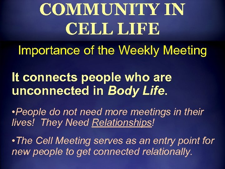 COMMUNITY IN CELL LIFE Importance of the Weekly Meeting It connects people who are unconnected in Body Life. • People do not need more meetings in their lives! They Need Relationships! • The Cell Meeting serves as an entry point for new people to get connected relationally.