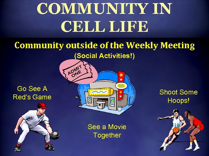 COMMUNITY IN CELL LIFE Community outside of the Weekly Meeting (Social Activities!) Go See A Red’s Game Shoot Some Hoops! See a Movie Together