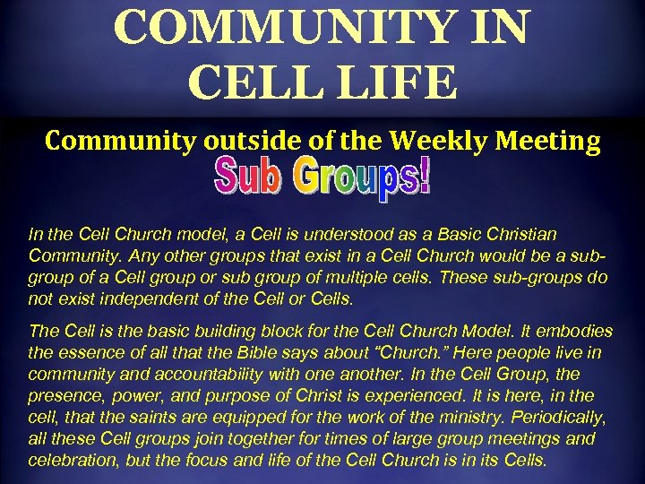 COMMUNITY IN CELL LIFE Community outside of the Weekly Meeting In the Cell Church model, a Cell is understood as a Basic Christian Community. Any other groups that exist in a Cell Church would be a subgroup of a Cell group or sub group of multiple cells. These sub-groups do not exist independent of the Cell or Cells. The Cell is the basic building block for the Cell Church Model. It embodies the essence of all that the Bible says about “Church. ” Here people live in community and accountability with one another. In the Cell Group, the presence, power, and purpose of Christ is experienced. It is here, in the cell, that the saints are equipped for the work of the ministry. Periodically, all these Cell groups join together for times of large group meetings and celebration, but the focus and life of the Cell Church is in its Cells.