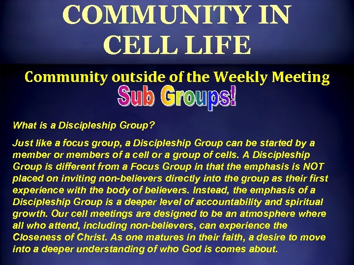 COMMUNITY IN CELL LIFE Community outside of the Weekly Meeting What is a Discipleship Group? So where does one turn to experience a deeper level of accountability and a study of God’s Word or principles? This is where the Discipleship Group comes into play. It’s a group of folks who might get together for eight weeks to study a book of the Bible. Perhaps a group of men will get together to discuss a book written on men’s topics. The same can be true of women getting together to study a book written on women’s topics. Perhaps a group of parents will get together for several weeks to study and discuss biblical parenting. The possibilities are great.