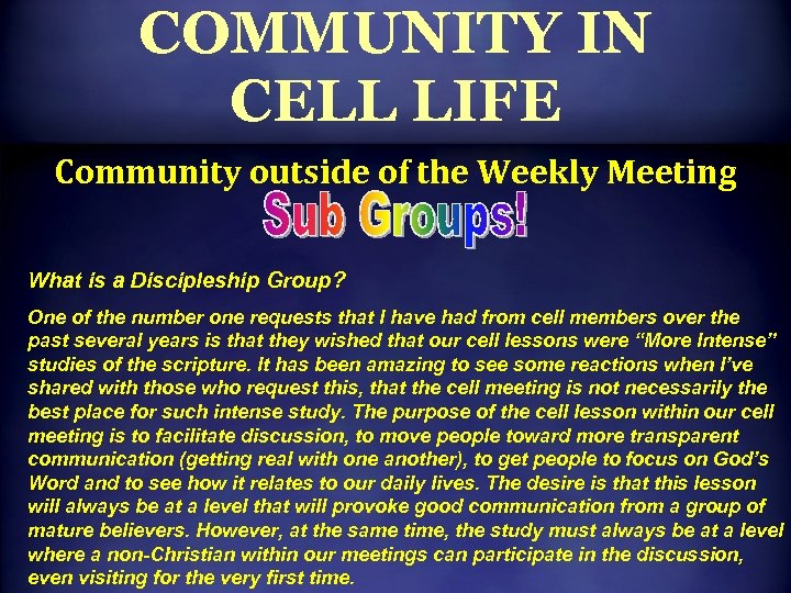 COMMUNITY IN CELL LIFE Community outside of the Weekly Meeting What is a Discipleship Group? One of the number one requests that I have had from cell members over the past several years is that they wished that our cell lessons were “More Intense” studies of the scripture. It has been amazing to see some reactions when I’ve shared with those who request this, that the cell meeting is not necessarily the best place for such intense study. The purpose of the cell lesson within our cell meeting is to facilitate discussion, to move people toward more transparent communication (getting real with one another), to get people to focus on God’s Word and to see how it relates to our daily lives. The desire is that this lesson will always be at a level that will provoke good communication from a group of mature believers. However, at the same time, the study must always be at a level where a non-Christian within our meetings can participate in the discussion, even visiting for the very first time.