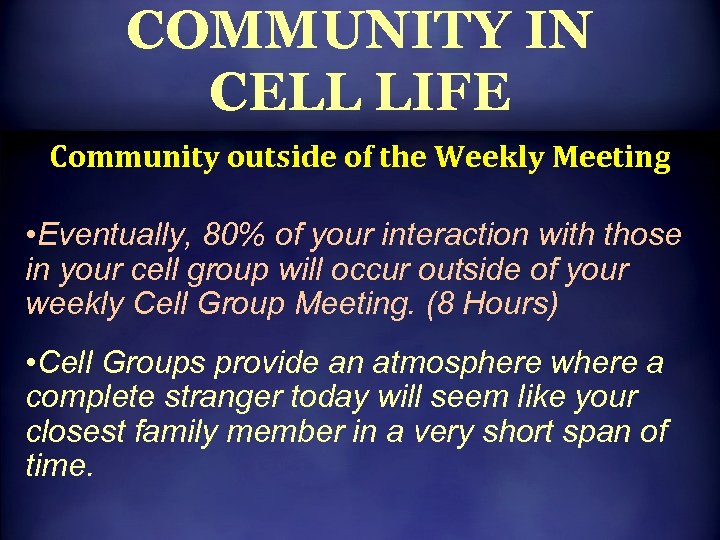 COMMUNITY IN CELL LIFE Community outside of the Weekly Meeting • Eventually, 80% of your interaction with those in your cell group will occur outside of your weekly Cell Group Meeting. (8 Hours) • Cell Groups provide an atmosphere where a complete stranger today will seem like your closest family member in a very short span of time.