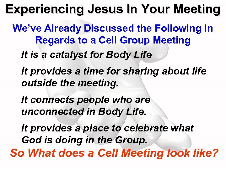 Experiencing Jesus In Your Meeting We’ve Already Discussed the Following in Regards to a Cell Group Meeting It is a catalyst for Body Life It provides a time for sharing about life outside the meeting. It connects people who are unconnected in Body Life. It provides a place to celebrate what God is doing in the Group. So What does a Cell Meeting look like?