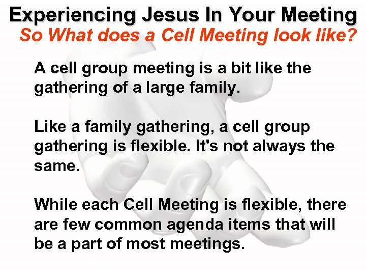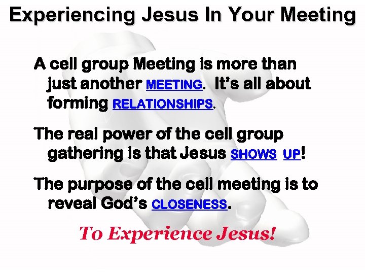 Experiencing Jesus In Your Meeting A cell group Meeting is more than just another MEETING. It’s all about forming RELATIONSHIPS. The real power of the cell group gathering is that Jesus SHOWS UP! The purpose of the cell meeting is to reveal God’s CLOSENESS. To Experience Jesus!