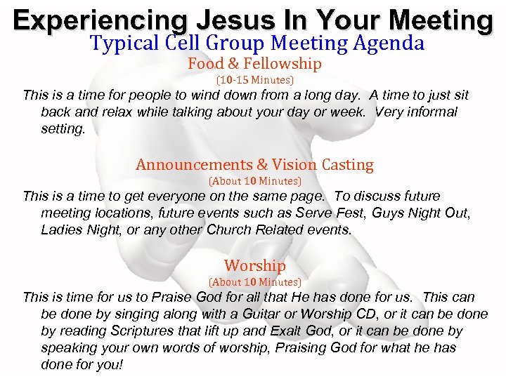 Experiencing Jesus In Your Meeting Typical Cell Group Meeting Agenda Food & Fellowship (10 -15 Minutes) This is a time for people to wind down from a long day. A time to just sit back and relax while talking about your day or week. Very informal setting. Announcements & Vision Casting (About 10 Minutes) This is a time to get everyone on the same page. To discuss future meeting locations, future events such as Serve Fest, Guys Night Out, Ladies Night, or any other Church Related events. Worship (About 10 Minutes) This is time for us to Praise God for all that He has done for us. This can be done by singing along with a Guitar or Worship CD, or it can be done by reading Scriptures that lift up and Exalt God, or it can be done by speaking your own words of worship, Praising God for what he has done for you!