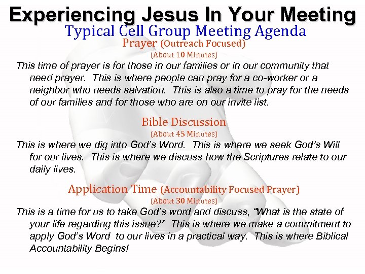 Experiencing Jesus In Your Meeting Typical Cell Group Meeting Agenda Prayer (Outreach Focused) (About 10 Minutes) This time of prayer is for those in our families or in our community that need prayer. This is where people can pray for a co-worker or a neighbor who needs salvation. This is also a time to pray for the needs of our families and for those who are on our invite list. Bible Discussion (About 45 Minutes) This is where we dig into God’s Word. This is where we seek God’s Will for our lives. This is where we discuss how the Scriptures relate to our daily lives. Application Time (Accountability Focused Prayer) (About 30 Minutes) This is a time for us to take God’s word and discuss, “What is the state of your life regarding this issue? ” This is where we make a commitment to apply God’s Word to our lives in a practical way. This is where Biblical Accountability Begins!