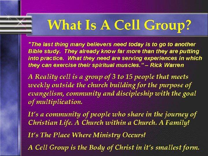 What Is A Cell Group? "The last thing many believers need today is to go to another Bible study. They already know far more than they are putting into practice. What they need are serving experiences in which they can exercise their spiritual muscles. ” – Rick Warren A Reality cell is a group of 3 to 15 people that meets weekly outside the church building for the purpose of evangelism, community and discipleship with the goal of multiplication. It’s a community of people who share in the journey of Christian Life. A Church within a Church. A Family! It’s The Place Where Ministry Occurs! A Cell Group is the Body of Christ in it’s smallest form.