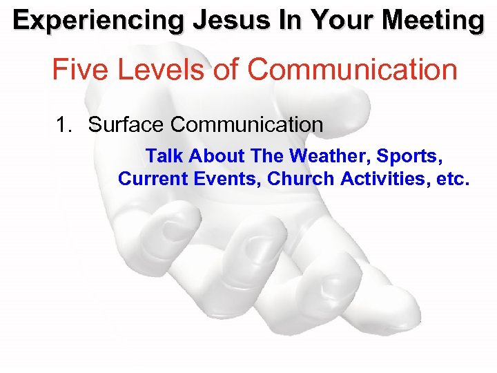 Experiencing Jesus In Your Meeting Five Levels of Communication 1. Surface Communication Talk About The Weather, Sports, Current Events, Church Activities, etc.