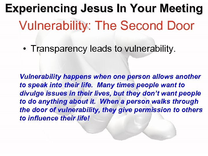 Experiencing Jesus In Your Meeting Vulnerability: The Second Door • Transparency leads to vulnerability. Vulnerability happens when one person allows another to speak into their life. Many times people want to divulge issues in their lives, but they don’t want people to do anything about it. When a person walks through the door of vulnerability, they give permission to others to influence their life!