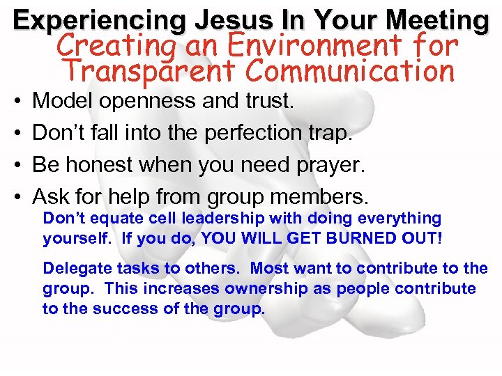 Experiencing Jesus In Your Meeting • • Creating an Environment for Transparent Communication Model openness and trust. Don’t fall into the perfection trap. Be honest when you need prayer. Ask for help from group members. Don’t equate cell leadership with doing everything yourself. If you do, YOU WILL GET BURNED OUT! Delegate tasks to others. Most want to contribute to the group. This increases ownership as people contribute to the success of the group.