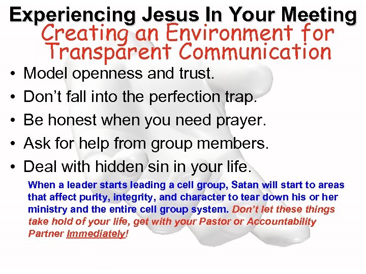 Experiencing Jesus In Your Meeting • • • Creating an Environment for Transparent Communication Model openness and trust. Don’t fall into the perfection trap. Be honest when you need prayer. Ask for help from group members. Deal with hidden sin in your life. When a leader starts leading a cell group, Satan will start to areas that affect purity, integrity, and character to tear down his or her ministry and the entire cell group system. Don’t let these things take hold of your life, get with your Pastor or Accountability Partner Immediately!