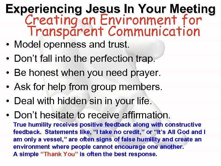 Experiencing Jesus In Your Meeting • • • Creating an Environment for Transparent Communication Model openness and trust. Don’t fall into the perfection trap. Be honest when you need prayer. Ask for help from group members. Deal with hidden sin in your life. Don’t hesitate to receive affirmation. True humility receives positive feedback along with constructive feedback. Statements like, “I take no credit, ” or “It’s All God and I am only a vessel, ” are often signs of false humility and create an environment where people cannot encourage one another. A simple “Thank You” is often the best response.