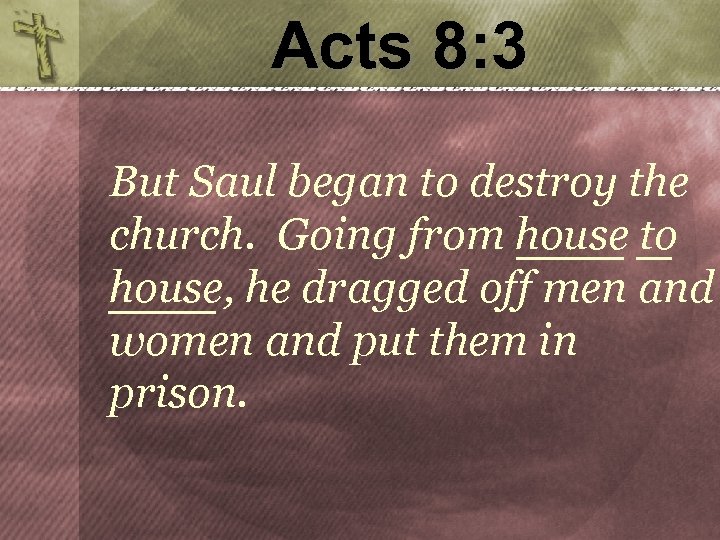 Acts 8: 3 But Saul began to destroy the church. Going from house to house, he dragged off men and women and put them in prison.