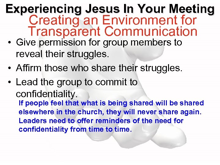 Experiencing Jesus In Your Meeting Creating an Environment for Transparent Communication • Give permission for group members to reveal their struggles. • Affirm those who share their struggles. • Lead the group to commit to confidentiality. If people feel that what is being shared will be shared elsewhere in the church, they will never share again. Leaders need to offer reminders of the need for confidentiality from time to time.